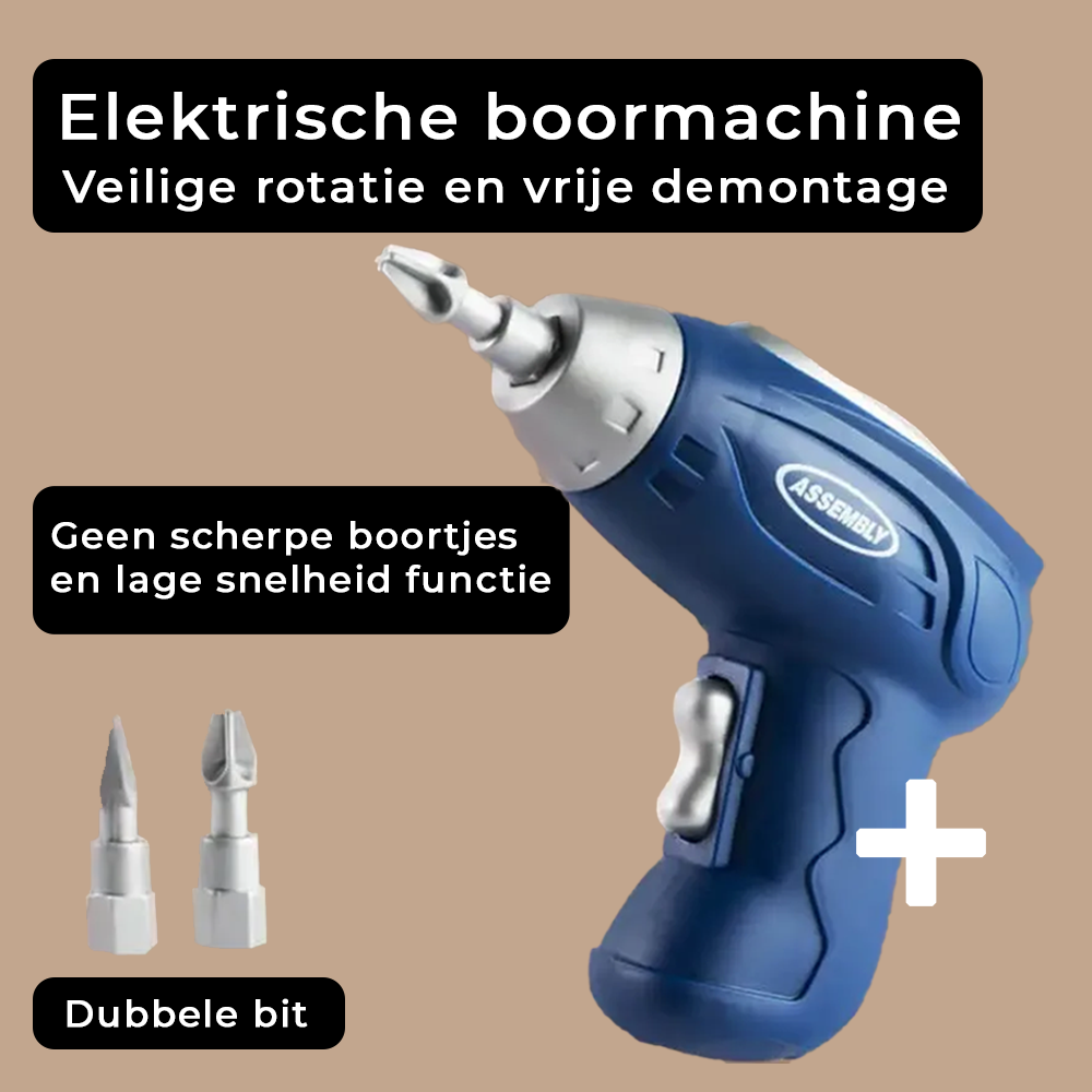 - Elektrische speelgoedboormachine (2 AAA-batterijen, niet inbegrepen) - Kinder-schroevendraaier en moersleutel - 70 paddenstoelbouten, 30 moeren en 60 schroeven - 40 geometrische bouwvormen - Stevige opbergkoffer met sticker (beer of hond) en handleiding
